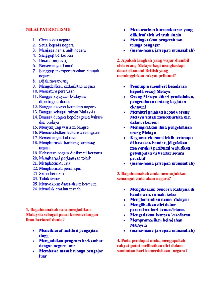 Cara menunjukkan semangat cinta akan negara. Kaedah ni dapat menggalakkan pelajar pelajar untuk terus mempraktikkan dan memahami sikap semangat cinta akan negara sehingga mereka dewasa. Hal ini demikian kerana negara kita malaysia yang dikenali dahulu dengan nama malaya pernah dijajah oleh kolonial jepun dan diikuti british tetapi oleh sebab kebijaksanaan dan semangat cinta akan negara berbekalkan jiwa yang kental mempunyai jati diri yang tinggi pejuang pejuang negara hati kecil saya teruja menghargai jasa jasa mereka. Amalan ini penting kerana kita dapat melahirkan masyarakat yang sentiasa cinta akan negara. Oleh itu semua pihak perlulah berganding bahu dan memainkan peranan masing masing agar semangat patriotik dapat dipupuk dan disuburkan dalam kalangan masyarakat.
