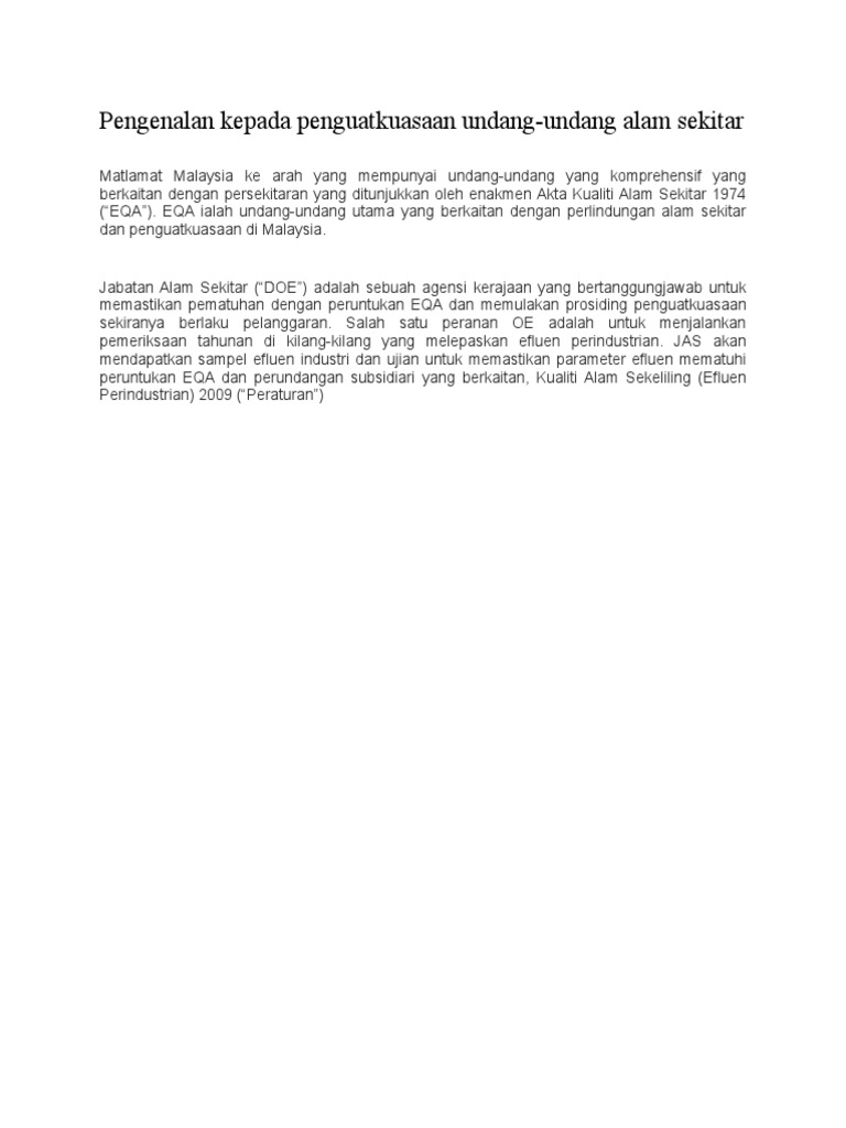 Melalui langkah penguatkuasaan undang undang jabatan alam sekitar jas merupakan jabatan di bawah kementerian sumber asli dan alam sekitar nre yang memainkan peranan untuk mempertingkatkan penguatkuasaan akta kualiti alam sekeliling 1974 dan peraturan peraturan di bawahnya yang menyekat pencemaran dari punca tetap point sources dengan izin. Melalui langkah penguatkuasaan undang undang jabatan alam sekitar jas merupakan jabatan di bawah kementerian sumber asli dan alam sekitar nre yang memainkan peranan untuk mempertingkatkan penguatkuasaan akta kualiti alam sekeliling 1974 dan peraturan peraturan di bawahnya yang menyekat pencemaran dari punca tetap point sources dengan izin. Dalam kehidupan kita pasti ada peraturan atau undang undang kerana peraturan dibuat untuk mengatur dan menertibkan manusia. Malaysia telah menggubalkan pelbagai undang undang peraturan dan akta untuk melindungi dan mencegah pencemaran alam sekitar.