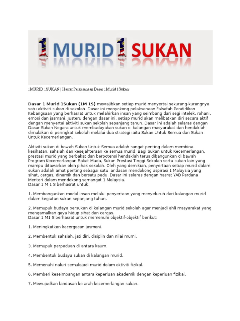 Dasar 1 murid 1 sukan. Pekeliling garis panduan pelaksanaan dasar 1 murid 1 sukan di sekolah 23 55 00 1 murid 1 sukan 1m1s modul sukan sukan dasar ini menyokong pelaksanaan falsafah pendidikan kebangsaan yang berhasrat untuk melahirkan insan yang seimbang dari segi intelek rohani emosi dan jasmani. Dasar satu murid satu sukan 1m 1s 1. Dasar ini menyokong pelaksanaan falsafah pendidikan kebangsaan yang memberikan tumpuan ke arah melahirkan insan yang seimbang dari segi intelek rohani emosi dan jasmani. Dasar 1 m1 s adalah diwajibkan untuk tahun 4 hingga tahun 6 di sekolah rendah dan peralihan tingkatan 1 hingga tingkatan 6 di sekolah menengah.