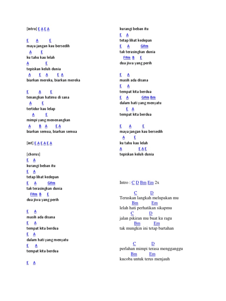 Em am sukarnya ku nyatakan d g perasaan padamu c am yang semakin merebah b7 em bersemi di kalbuku em am sungguhpun demikian d g terpaksa ku terima c am hakikat yang. Chord satu jiwa persis solo. B em c am d g a gbm gm bb eb chords for legacy dua jiwa satu hati with capo transposer play along with guitar piano ukulele mandolin. Last edit on feb 11 2014.