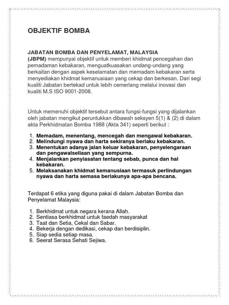 603 8888 0025 e mel. Korporat bomba gov my hakcipta terpelihara 2009 2019 jabatan bomba dan penyelamat malaysia. Mematikan khidmat operasi kebombaan dan penyelamat yang profesional dan berkualiti bagi mengelakkan ancaman kepada nyawa dan membendung kemusnahan hatra benda dan alam sekitar mengikut peruntukan undang undang. Perkhidmatan bomba di malaysia bermula pada tahun 1883 melalui penubuhan skuad bomba dan penyelamat negeri selangor yang diketuai oleh h f bellamy dan 15 orang anggota.
