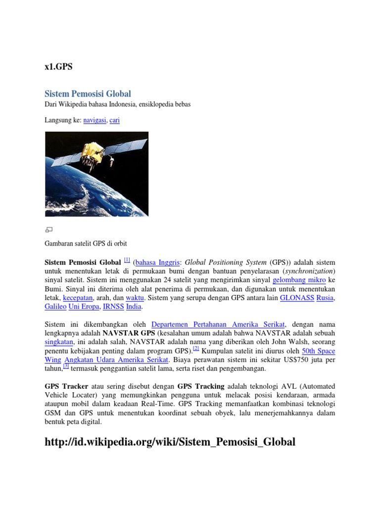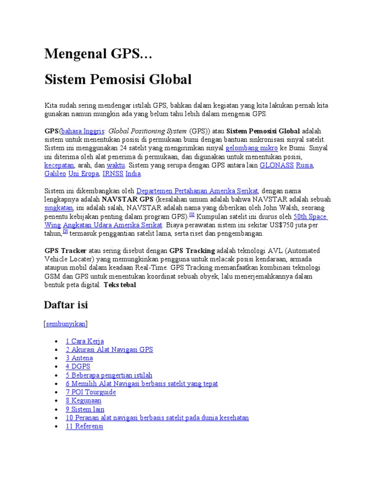 Dikutip dari wikipedia bahasa indonesia. Global positioning system gps adalah satu satunya sistem navigasi satelit yang berfungsi dengan baik. Sistem kedudukan sejagat bahasa inggris. Sinyal ini diterima oleh alat penerima di permukaan dan digunakan untuk menentukan posisi kecepatan arah dan waktu.