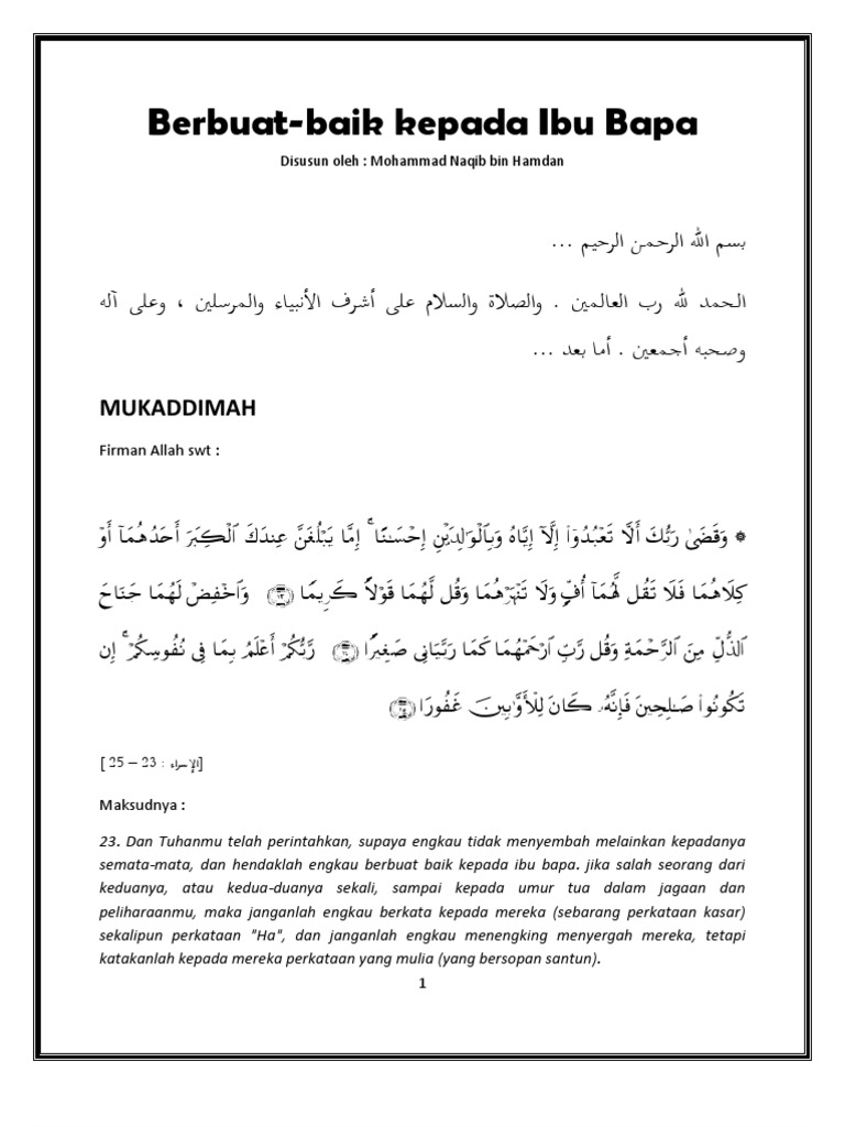 Hadis berbuat baik kepada ibu bapa. Pada hadits di atas dijelaskan bahwasanya berbuat baik kepada ibu adalah ibadah yang sangat agung bahkan dengan berbakti kepada ibu diharapkan bisa membantu taubat seseorang diterima allah taala. Ini kerana ibu bapa telah mencurahkan jasa bakti yang amat besar kepada anak anak sehingga mereka berkorban nyawa tenaga dan harta. Dan sembahlah allah dan janganlah menyekutukan nya dengan sesuatu dan berbuat baiklah kepada kedua ibu bapa kaum kerabat anak yatim orang miskin tetangga jauh teman sejawat ibnu sabil dan hamba sahaya sesungguhnya allah tidak menyukai orang sombong dan membanggakan dirinya. Derhaka kepada ibu adalah lebih berat dosanya berdasarkan sebuah hadis lain dimana rasulullah shallallahu alaihi wasallam mengkhususkan larangan berbuat derhaka kepada seorang ibu.