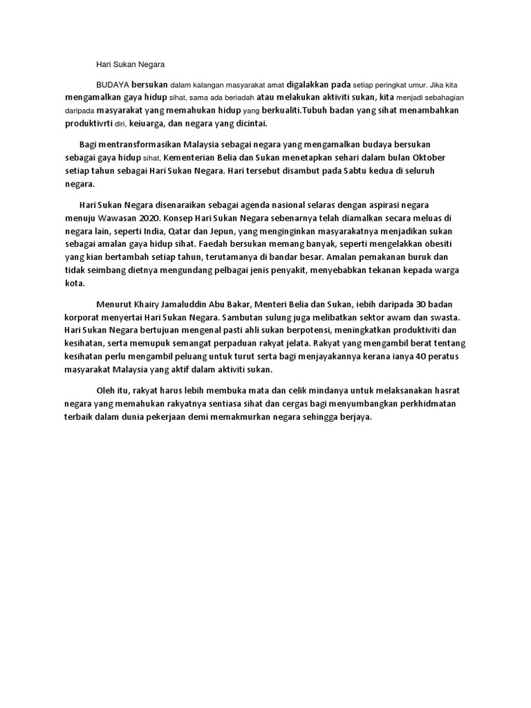 Hari sukan negara 2020. Sukan di negara ini mengalami zaman kemelesetan yang begitu ketara kerana tiada lagi kejayaan yang diraih seperti awa tahun 50 an 60 an atau 80 an. Contoh karangan kebaikan dan kepentingan aktiviti sukan kepada masyarakat dan negara. Temasya sukan ini diadakan di padang sekolah bermula pada pukul 8 30 pagi.