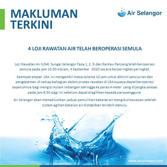 Air selangor air selangor september 3 2020 oleh sebab itu pihak mereka terpaksa membuang 150 juta air mentanh daripada kolam alternatif dan 500 juta liter daripada empangan bagi mengurangkan kesan pencemaran yang dimaksudkan. Katanya air selangor turut menyediakan pili awam dan pusat khidmat setempat bagi pengguna untuk mendapatkan bekalan air bersih. Kuala lumpur pengurusan air selangor sdn bhd air selangor ingin memaklumkan status terkini gangguan bekalan air tidak berjadual ekoran henti tugas loji rawatan air lra sungai selangor fasa 1 2 3 dan rantau panjang pada 3 september 2020. Terma tambahan mungkin.