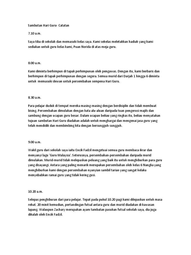 Karangan tujuan sambutan hari guru. Pada 16 mei 2011 yang lalu sekolah saya telah mengadakan sambutan hari guru. Tepat pada pukul 8 00 pagi guru guru dan murid murid telah berhimpun di dalam dewan. Pada hari isnin 17 mei 2016 sekolah menengah kebangsaan tengku mahkota telah mengadakan majlis sambutan hari guru bersempena dengan hari guru yang jatuh pada 16 mei 2016. Tanggal 16 mei merupakan hari guru.