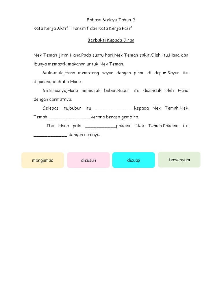 Kata kerja transitif aktif menggunakan imbuhan men men. Kata kerja pasif tahun 2 kata kerja pasif tahun 2 tahun 2 ms 67 kata kerja pasif kata kerja pasif tahun 1. Kata kerja aktif transitif dalam subjek bahasa melayu tahun 2. Contohnya akan tentang mengenai dengan di ke oleh dan lain lain salah dia bertemu rakannya di bandar dia bercerita pengalamannya di luar negara perompak itu berlari tepi jalan raya saya tidak terangkat kotak itu.
