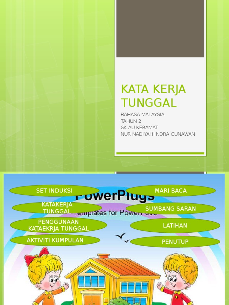 Murid murid mari kita belajar kata kerja tunggal bersama sama. Kata kerja ialah kata yang menunjukkan perbuatan yang dilakukan sama ada oleh manusia binatang atau benda.