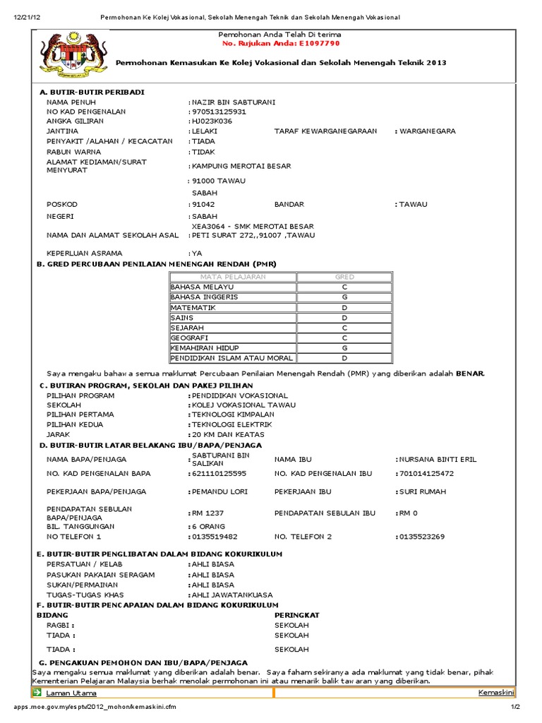 Kemasukan ke kolej vokasional. Calon calon pelajar yang telah membuat application ke program kolej vokasional kv dan sekolah menengah teknik smt bagi sesi pengambilan tahun 2021 boleh membuat semakan status tawaran secara dalam talian. Berikut adalah panduan dalam membuat permohonan kemasukan kv dan smt januari 2021 secara online. Panduan buat pelajar tingkatan 3 yang menduduki peperiksaan pentaksiran tingkatan tiga pt3 2020. Berminat melanjutkan pengajian ke kolej vokasional.