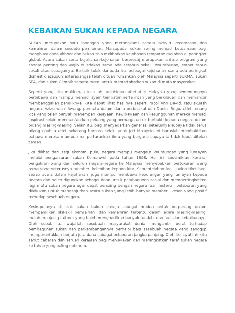 Hal ini demikian kerana aktiviti sukan mendatangkan faedah yang banyak kepada masyarakat dan negara kita. ΓΈ sektor swasta digalakkan untuk melengkapi usaha kerajaan dalam menyedia kemudahan sukan dan rekreasi di kawasan yang akan dibangunkan untuk tujuan kediaman komersil dan perindustrian. Setiap tahun sekolah sekolah akan sibuk mengadakan hari sukan. Sukan berkembang menjadi satu industri seperti yang terdapat di negara negara maju.