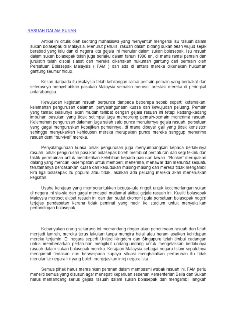 Dalam era modenisasi kini isu rasuah kepada negara kerap kali terpampang di dada dada akhbar atau di skrin televisyen. Keburukan rasuah kepada diri individu kesan rasuah dalam sukan kesan rasuah terhadap masyarakat dan negara karangan kesan rasuah terhadap masyarakat punca rasuah langkah mengatasi rasuah definisi rasuah kesan rasuah dan amalan tidak jujur dalam sukan. Antara kesan rasuah terhadap negara ialah kegiatan rasuah akan melumpuhkan fungsi perjalanan sesuatu organisasi. Terdapat satu kes di mana sprm telah menangkap seorang awam yang telah melakukan rasuah.