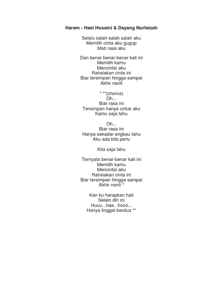 Lirik lagu haram hael husaini. Blog lirik lagu ini tidak menyediakan sebarang link untuk download lagu mp3 dari samada dalam format mp3 atau sebarang format audio yang lain. Lirik lagu mencuba sufian suhaimi. Lirik lagu haram hael husaini dayang nurfaizah. Lirik lagu haram hael husaini ft dayang nurfaizah adalah seperti berikut.