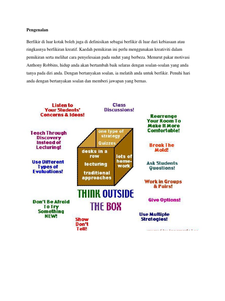 Berfikir di dalam kotak itu justru dapat membahayakan diri kita mungkin kita menganggap bahwa kita sudah cukup berfikir dalam kotak saja masalahnya beban akan terus bertambah persaingan akan semakin ketat jika kita hanya berfikir didalam kotak sementara orang lain berfikir di luar kotak dengan ide ide baru yang inovatif ide ide baru yang terobosan maka kita akan kalah kita akan tenggelam. Berfikir di dalam kotak itu justru dapat membahayakan diri kita mungkin kita menganggap bahwa kita sudah cukup berfikir dalam kotak saja masalahnya beban akan terus bertambah persaingan akan semakin ketat jika kita hanya berfikir didalam kotak sementara orang lain berfikir di luar kotak dengan ide ide baru yang inovatif ide ide baru yang terobosan maka kita akan kalah kita akan tenggelam. Dalam definisi yang lebih luas berpikir di luar kotak dideskripsikan sebagai suatu cara pikir baru di luar kebiasaan dari cara berpikir. Berfikir di luar kotak think out of the box adalah berfikir di luar kebiasaan dan mencabar tradisi dengan membangkitkan rasa tidak puas hati dan mengeluarkan diri dari zon selesa.