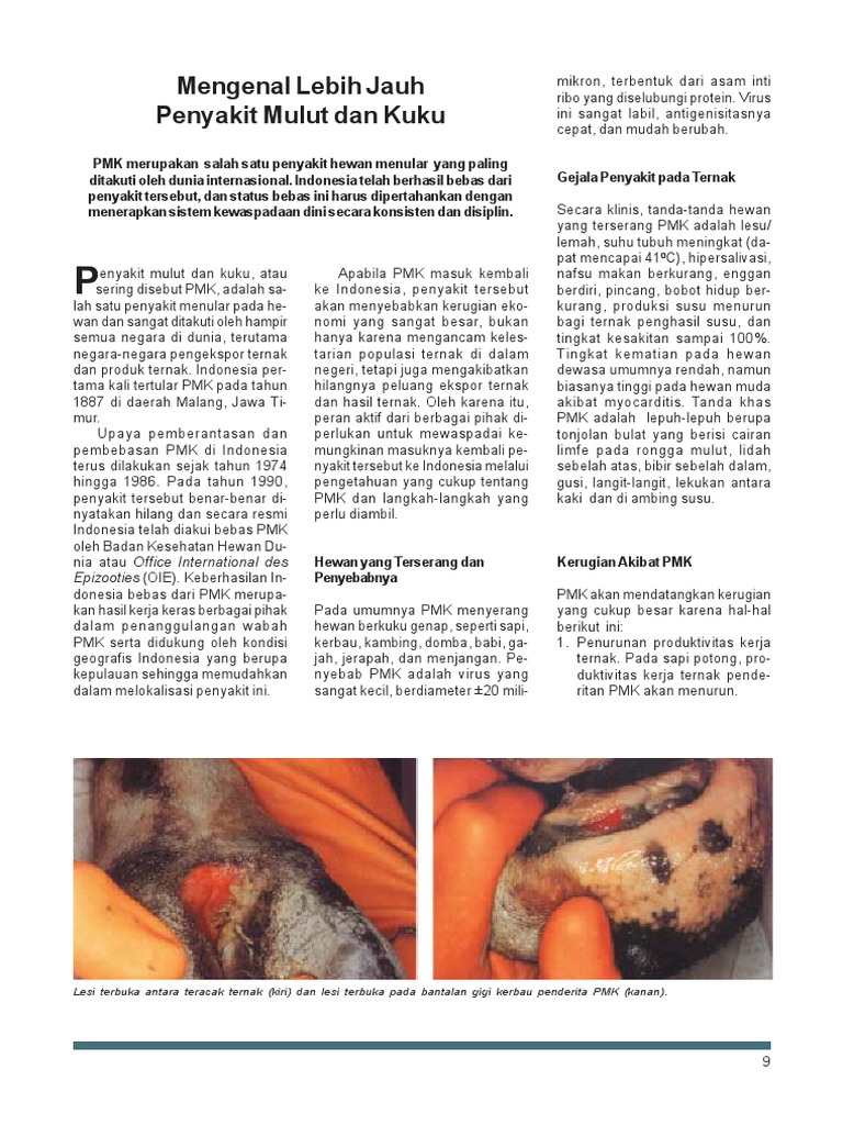 Penyakit kuku dan mulut menyerang hewan. Satu satunya penyebab pmk yang menyerang indonesia saat ini yaitu virus dari tipe o. Pencegahan penyakit mulut dan kuku pmk disebabkan oleh virus dari genus apthovirus famili picornaviridae yang berukuran sekitar 20 25 mikron. Penyakit kuku dan mulut fmd memiliki implikasi yang parah untuk peternakan karena sangat menular dan dapat disebarkan oleh hewan yang terinfeksi melalui aerosol melalui kontak dengan peralatan pertanian yang terkontaminasi kendaraan pakaian atau pakan dan oleh predator domestik ataupun liar. Selain menyebabkan kelumpuhan pada hewan virus ini juga menyebabkan sariawan.