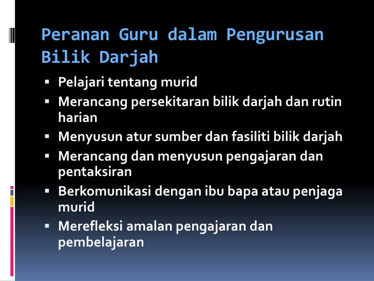 Peranan guru dalam pengurusan bilik darjah. Kajian mendapati bahawa guru yang menjadikan pengurusan bilik darjah sebagai proses mewujudkan dan mengekalkan keberkesanan persekitaran pembelajaran akan cenderung untuk berjaya berbanding guru yang menekankan tugas sebagai guru dispin dan pentadbir semata mata good brophy. Peranan guru sebagai pengurus bilik darjah amat penting dalam pengurusan bilik darjah adalah efisien. Peranan guru dalam pengurusan bilik darjah 1. Peraturan biasanya tidak berubah kerana peraturan seperti menghormati hak orang lain adalah merupakan cara asas setiap individu harus mematuhinya.