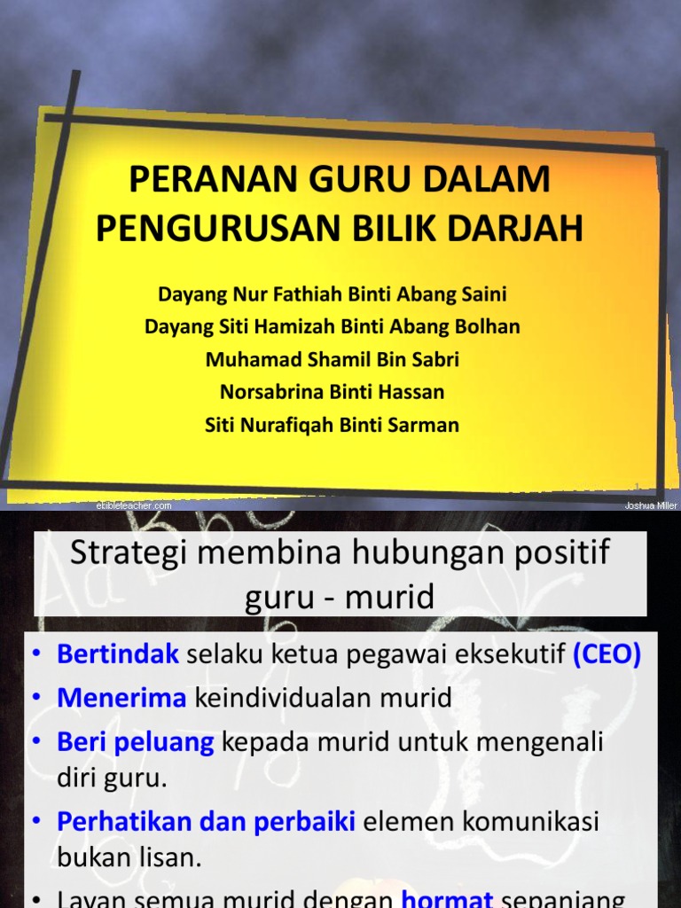 Peranan guru dalampengurusan bilik darjah 2. Kajian mendapati bahawa guru yang menjadikan pengurusan bilik darjah sebagai proses mewujudkan dan mengekalkan keberkesanan persekitaran pembelajaran akan cenderung untuk berjaya berbanding guru yang menekankan tugas sebagai guru dispin dan pentadbir semata mata good brophy. Pembelajaran abad 21 kini guru dilihat bertindak sebagai fasilitator pembimbing dan kaunselor yang sentiasa komited dengan kerjayanya yang serba mencabar ini. Antara bidang yang dibincangkan adalah subjek kemahiran belajar pengantar pendidikan murid dan alam belajar pengurusan bilik darjah dan tingkah laku budaya dan pembelajaran guru dan cabaran semasa dan asas kepemimpinan dan perkembangan profesionalisme bagi pelajar pismp ipg kpm dan subjek ilmu pendidikan khusus bagi pelajar kpli ipg kpm dan ipta amnya gunakanlah blog ini untuk mendapatkan.