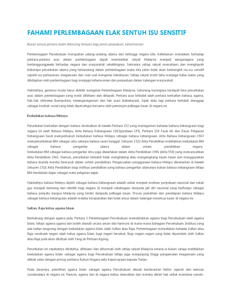 Perkara sensitif dalam perlembagaan malaysia. Sebagai sebuah negara yang mempunyai masyarakat pelbagai kaum memahami perlembagaan penting supaya isu sensitif yang termaktub dalam perlembagaan tidak dipersoalkan. Isu isu perlembagaan persekutuan malaysia 1984 isu pengajaran subjek matematik dan sains dalam bahasa melayu persoalannya dimanakah tindakan kerajaan. ڤرلمباڬأن مليسيا dikenali juga sebagai perlembagaan persekutuan malaysia mengandungi 183 perkara adalah undang undang tertinggi di malaysia. Warganegara malaysia mempunyai kebebasan dalam mengeluarkan pendapat dan buah fikiran mereka setakat mereka tidak menyentuh pada isu isu sensitif yang telah dikenal pasti oleh parlimen dalam perkara 10 4.
