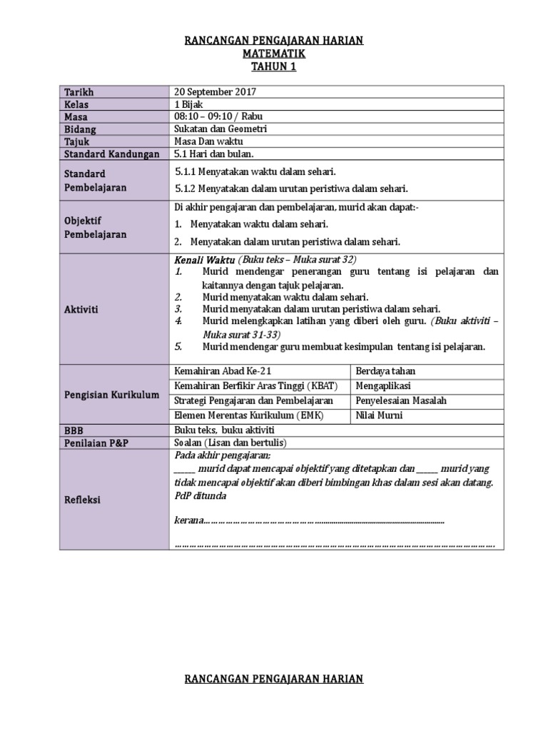Rancangan pengajaran harian rancangan mengajar. Rph matematik tahun 1 adalah rancangan pengajaran harian yang perlu disediakan lebih awal oleh guru sebelum menjalankan sesi pegajaran dan pembelajaran rancangan pengajaran harian ini dibina sebagai panduan para guru untuk mengajar dengan lebih sistematik dan efektif serta mampu untuk mencapai apa yang diobjektifkan dalam sesi pengajaran dan pembelajaran kelak. Pelajar dan guru dapat memanfaatkan penggunaan ict bagi memberikan impak kualiti yang baik dalam pembelajaran pada masa kini. 13 1 mengenalpasti bentuk tiga.
