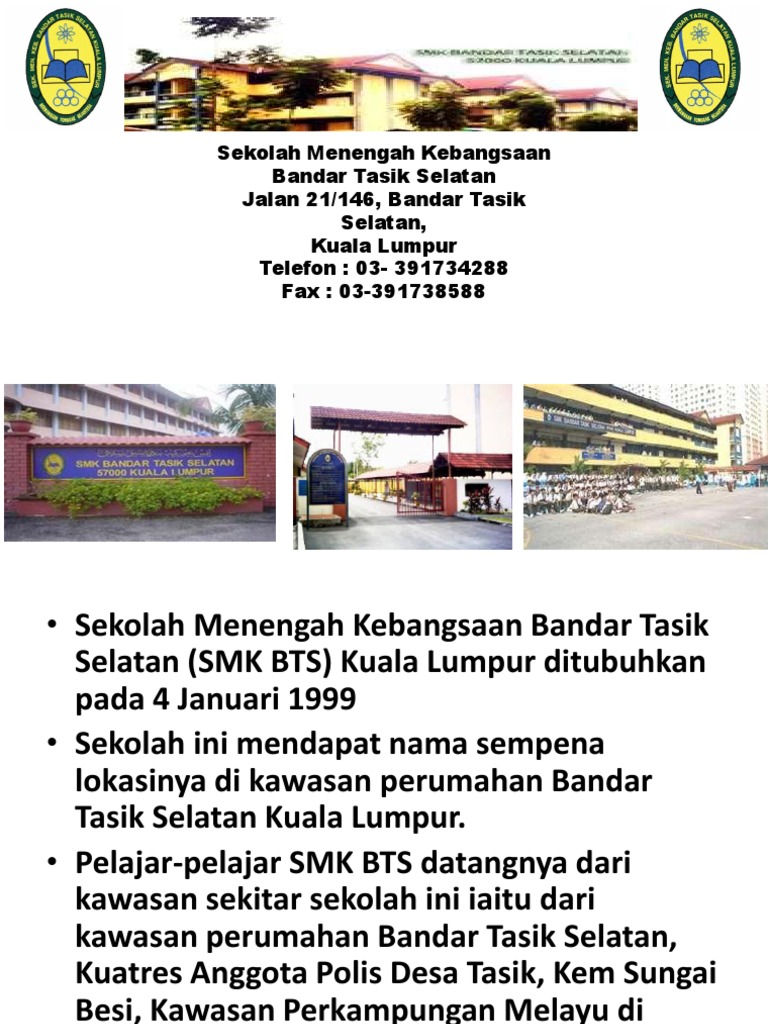 Ruangan ini memaparkan tentang latar belakang serta perkembangan yang berlaku di smk bts anda hanya perlu menekan butang disediakan sahaja untuk mengetahui tentang latar belakang sekolah kami. Sementara menanti bangunan sendiri siap sepenuhnya smk bts telah menumpang di bangunan smk sungai besi kuala lumur sehingga 6 jun 1999. Pengenalan sekolah sekolah menengah kebangsaan bandar tasik selatan smkbts kuala lumpur ditubuhkan pada 4 januari 1999. Sekolah menengah sains alam shah asis bandar tun razak.