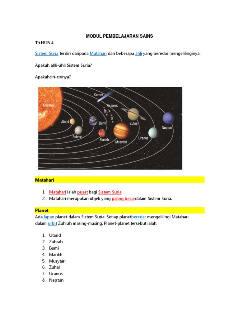 Matahari adalah sebuah bintang dan merupakan pusat. Sistem suria terdiri daripada. Tahun 5 unit 5. Dari kebanyakan objek yang mengorbit matahari kebanyakan dari jisim tersebut ditampung didalam lapan yang relatifnya planet.