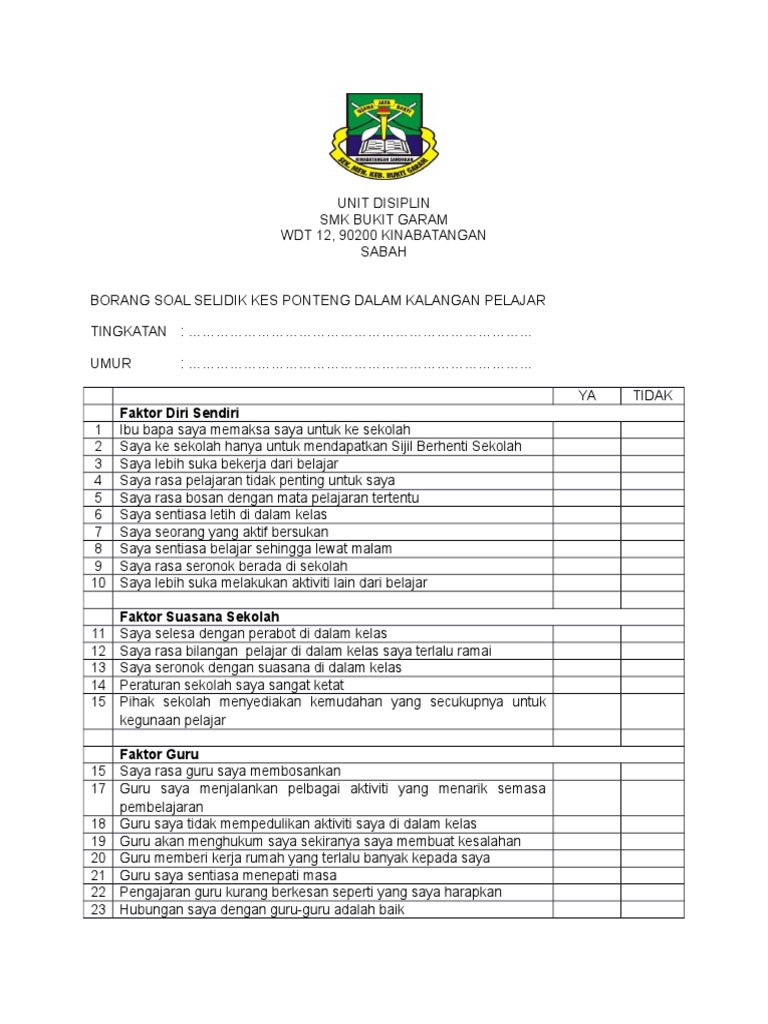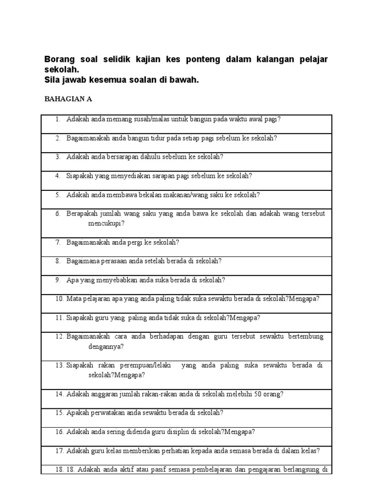 Sila jawab kesemua soalan di bawah. Lee 1992 mendapati pelajar sendiri yang menjadi punca perlakuan salahlaku di sekolah. Borang soal selidik pengurusan ponteng sekolah dan pengaruhnya terhadap masalah ponteng dalam kalangan pelajar sekolah rendah di daerah kota belud. Bagaimanakah anda bangun tidur pada setiap pagi sebelum ke sekolah.