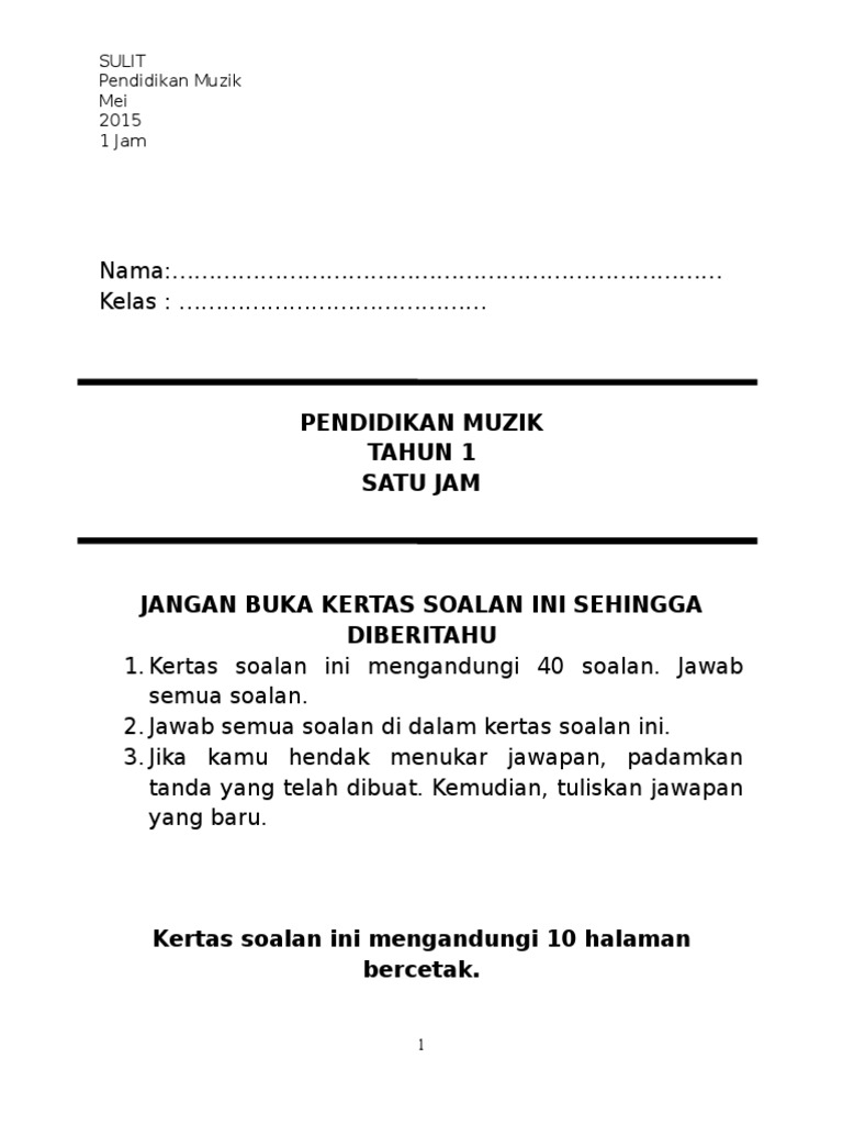 Soalan pendidikan muzik tahun 1. Perkongsian melibatkan ujian akhir tahun 2019 bagi tahun 1 hingga tahun 6 kssr termasuk kssr semakan. Selari dengan perkembangan pesat teknologi digital kementerian pendidikan malaysia akan menggunakan teknologi dan kandungan digital dalam dalam bidang pendidikan. Soalan soalan muzik yang disediakan sangat sangat membantu saya dalam pdp harian. Inovasi pendigitalan buku teks membolehkan.