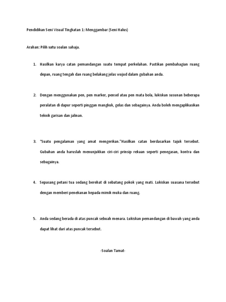 Bank soalan seni visual tingkatan 1 kssm 2017. Bank soalan pertengahan tahun kssm tingkatan 2 adalah antara bahan bahan terbaik yang kami ada bahan yang terdapat di sini memenuhi keperluan pentaksiran berasaskan sekolah yang dilaksanakan secara menyeluruh mengikut prinsip bahawa semua mata pelajaran yang terkandung dalam kssm memainkan peranan yang penting bagi memenuhi keperluan jasmani rohani emosi dan intelek untuk membantu. Bank soalan seni tingkatan 2 kssm 2018. Kepada ibu bapa guru guru dan pelajar yang terlibat bolehlah merujuk kepada kalendar sekolah yang berkenaan untuk memastikan.