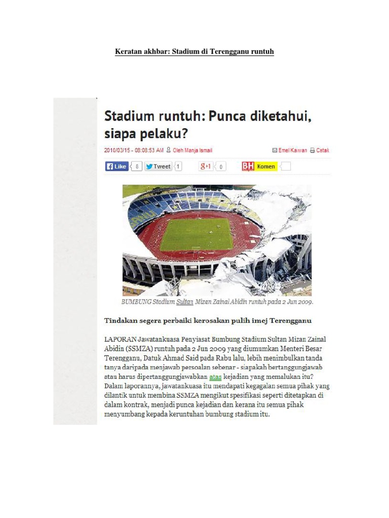 Stadium sultan mizan zainal abidin runtuh. Stadium sultan mizan zainal abidin adalah stadium pelbagai guna yang terletak di gong badak terengganu malaysia ia biasanya digunakan untuk perlawanan bola sepak dan menjadi tuan rumah bagi pasukan bola sepak terengganu f c i dan t team. Ms channel 10 288 views. Runtuhan itu membabitkan bumbung sepanjang 80 meter daripada keseluruhan 134 meter meliputi kawasan tempat duduk berbumbung termasuk pentas diraja. It was used mostly for football matches.