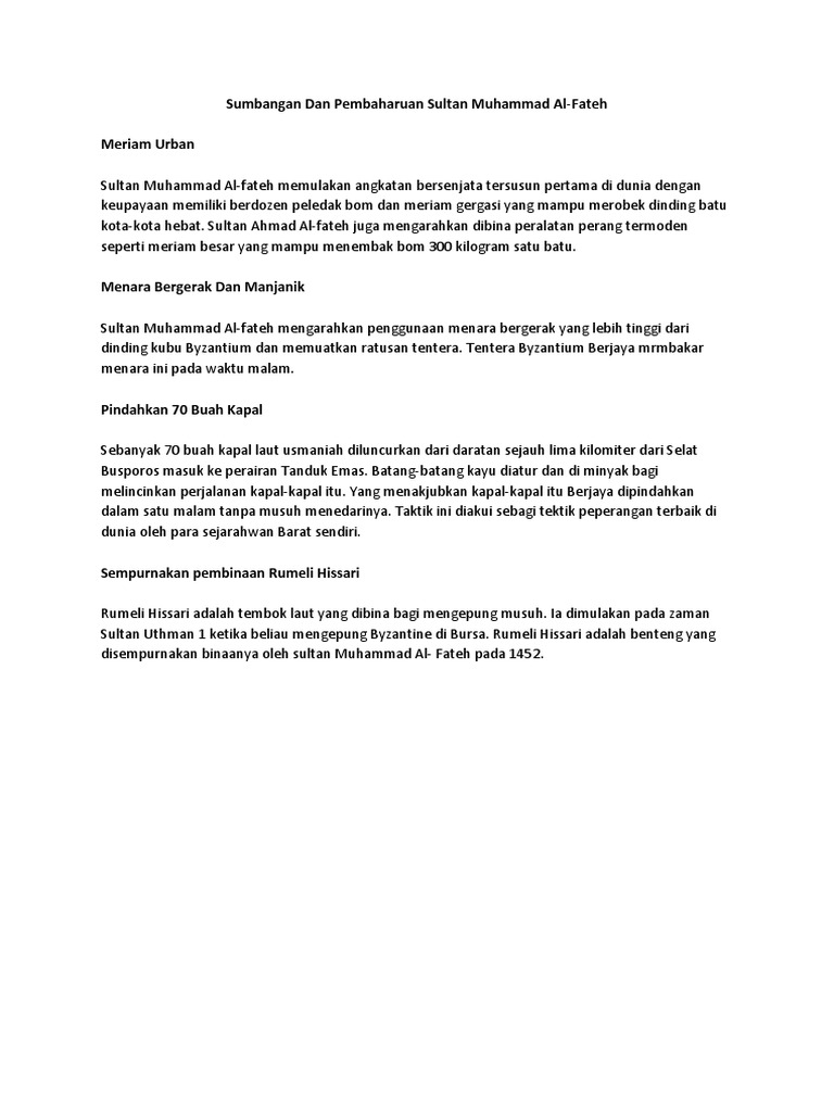 Pada 27 mei 1453 sultan muhammad al fatih bersama tentaranya berusaha keras membersihkan diri di hadapan allah subhana wa ta ala. Huraikan kepemimpinan dan sumbangan khalifah sultan muhammad al fatih pendahuluan nama sebenar baginda ialah muhammad bin murad bin muhammad bin bayazid lahir pada 29 mac 1432 m di adrianapolis dan meninggal pada 3 mei 1481 ketika berumur 49 tahun. Pada tahun1458 berlaku krisis di istana belgrade akibat perebutan kuasa. Pada bulan rabiul awal tahun 886 h 1481 m sultan muhammad al fatih pergi dari istanbul untuk berjihad padahal ia sedang dalam kondisi tidak sehat.