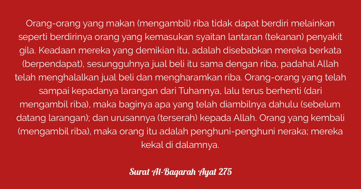 Infakkanlah dengan mengeluarkan sebagian dari rezeki yang telah kami berikan kepadamu baik dalam ben 2 254. Orang orang yang memakan riba yakni melakukan transaksi riba dengan mengambil atau menerima kelebihan di atas modal dari orang yang butuh dengan mengeksploitasi atau memanfaatkan kebutuhannya tidak d 2 275. Orang orang yang memakan riba tidak dapat berdiri melainkan seperti berdirinya orang yang kemasukan setan karena gila.