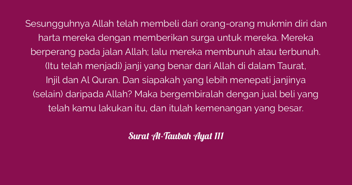 Surah at taubah ayat 111 dan artinya. Maka bergembiralah dengan jual beli yang telah kamu lakukan itu dan itulah kemenangan yang besar. Janji yang benar dari allah di dalam taurat injil dan al quran. Dan bergabunglah bersama orang orang yang jujur dalam keimanan ucapan dan perbuatannya. Baca ayat al quran tafsir hadits dan konten islami bahasa indonesia.