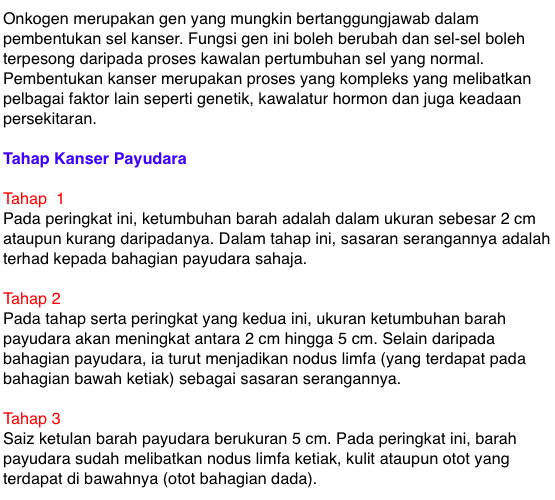 Jom lihat apakah tanda kanser rahim berdasarkan 3 peringkat ini. Walaupun kanser payudara di peringkat awal biasanya tidak menyebabkan kesakitan wanita haruslah berjumpa dengan doktor atau kakitangan perubatan yang berkelayakan sekiranya berasa sakit pada bahagian payudara mereka atau tanda tanda tersebut tidak hilang. Ini akan memudahkan anda mengatasi penyakit kanser anda dengan lebih cekap dan berkesan. Mengetahui salah satu gejala atau tanda tanda kanser berikut tidak bermakna anda mempunyai kanser.