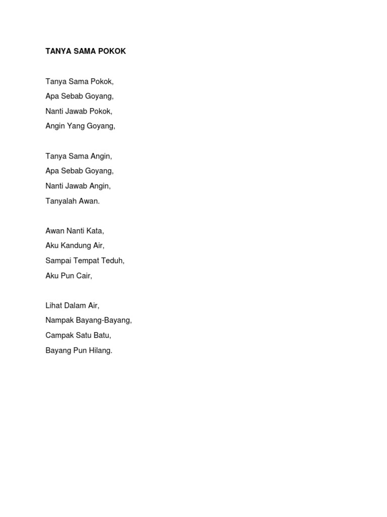 Lirik lagu tanya sama pokok lagu kanak kanak tanya pada pokok apa sebab goyang nanti jawab pokok angin yang goncang tanya sam. Tanya sama pokok apa sebab goyang jawab angin yang goncang terbang burung terbang patah sayap diduga seandainya rebah kau masih ada terlalu mahu dan mahu terlupa apa yang perlu terlalu banyak alasannya duduk terdiam. Tanya sama hati apa rasa. Awan nanti kata aku kandung air sampai tempat sejuk aku pun cair tengok dalam air nampak bayang bayang campak satu batu bayang pun hilang.