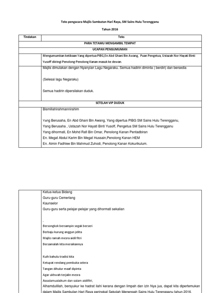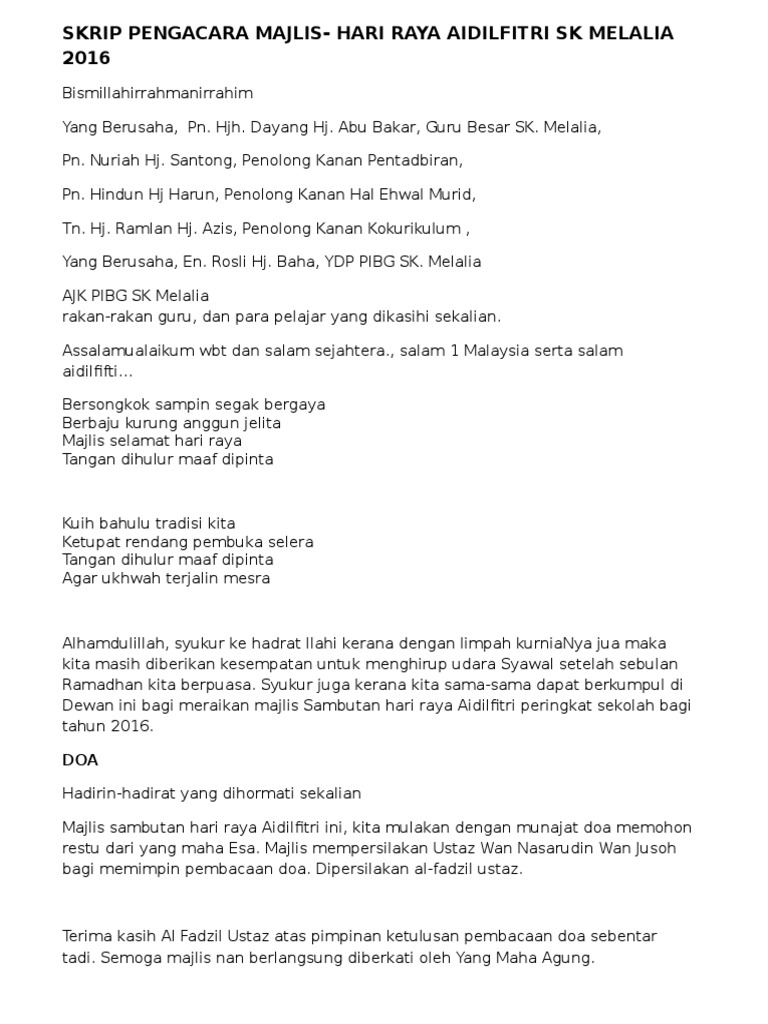 Para hadirin diminta mengambil tempat masing masing kerana majlis akan bermula sebentar sahaja lagi. Jadi hidangan di pagi hari. Slideshare uses cookies to improve functionality and performance and to provide you with relevant advertising. Skrip pengacara majlis hari raya sambutan hari raya aidilfitri smkpnz 2008 siti ruhana mengumumkan ketibaan yang berbahagia en.