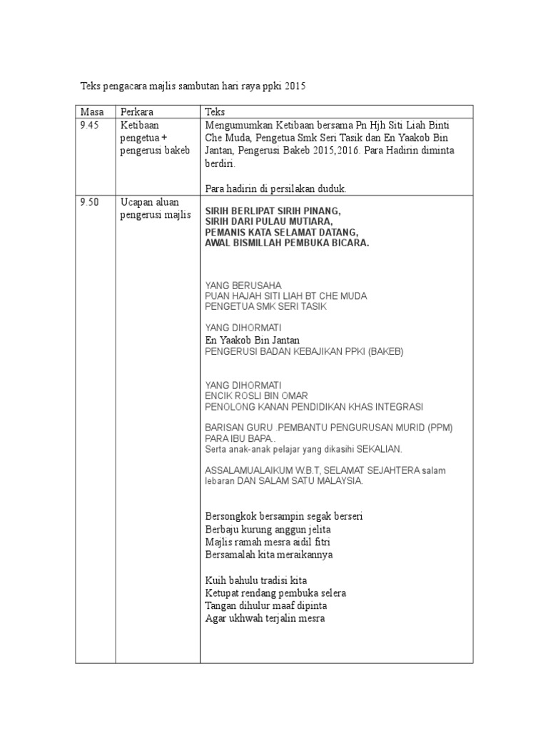Teks pengacara majlis sambutan hari raya. Teks pengacara majlis sambutan hari raya. Majlis merakamkan setinggi tinggi penghargaan dan terima kasih kepada yang berusaha. Majlis sambutan hari raya aidilfitri darul kifayah 2014 lelaki nyanyian lagu negaraku dan lagu maiwp perempuan hadirin dipersilakan duduk lelaki yang berbahagia dato haji mohamad bin s. Ab halim bin hj hassan.