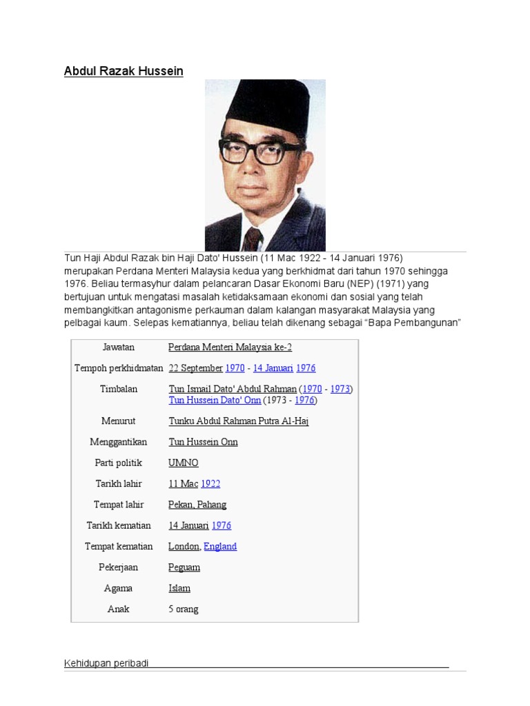 Tun abdul razak bin datuk hussein yang juga dikenali sebagai bapa pembangunan telah dilahirkan pada 11 mac 1922 di pulau keladi pekan pahang. Tun abdul razak datuk hussein 24 jan 1971 14 jan 1976 perdana menteri malaysia kedua. Allahyaraham tun abdul razak dato hussein lebih dikenali sebagai bapa pembangunan malaysia oleh rakyat yang menyanjunginya yang juga mengenali beliau sebagai tun razak. Tun abdul razak bin dato hussein apabila dilantik sebagai timbalan perdana menteri juga turut memegang portfolio menteri pertahanan pada tahun 1957.