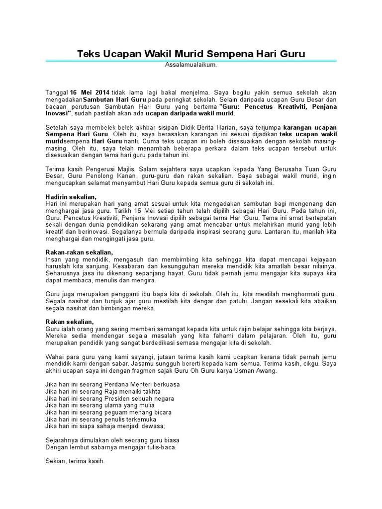 Salam sejahtera saya ucapkan kepada tuan guru besar guru penolong kanan guru guru dan rakan sekalian saya sebagai wakil murid ingin mengucapkan selamat menyambut hari guru kepada semua guru di sekolah ini. Pencetus kreativiti penjana inovasi sudah pastilah akan ada ucapan daripada wakil murid. Setelah saya membelek belek akhbar sisipan didik berita harian saya terjumpa karangan ucapan sempena hari guru. Biasanya hari ini sekolah akan meriah dengan pelbagai aktiviti sambutan hari guru.