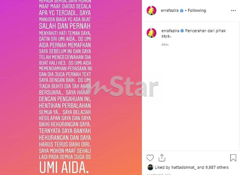 Petaling jaya june 14 no one knows what it was really about but yet the pointed tone of an instagram post by datin seri umie aida for a fake friend has been followed by an apology by erra fazira. Berita terkini foto dan video dunia dan malaysia. Erra fazira minta maaf pada umie aida selepas tiga kali buat silap pada sahabatnya itu. The 45 year old erra took to instagram earlier today admitting that she was to blame for the spat between them.