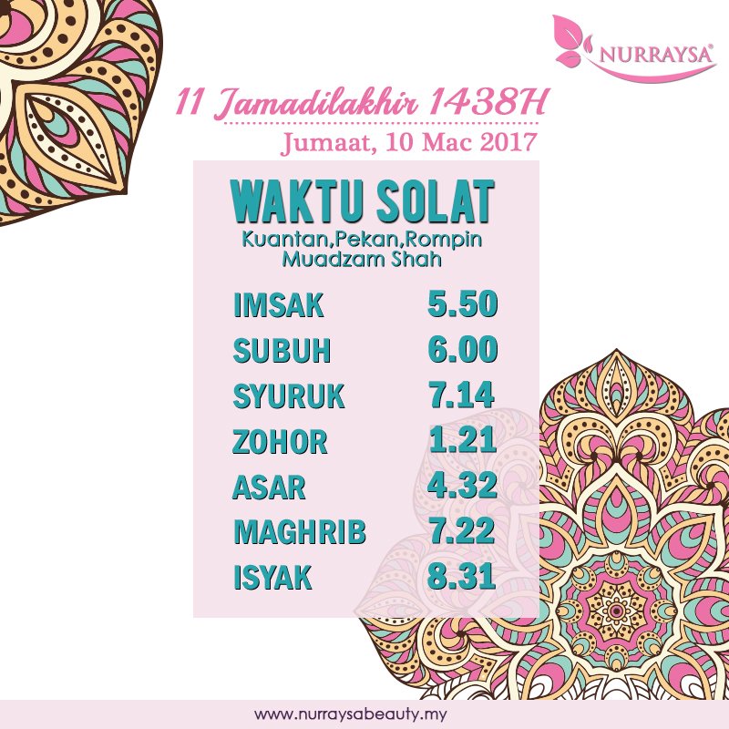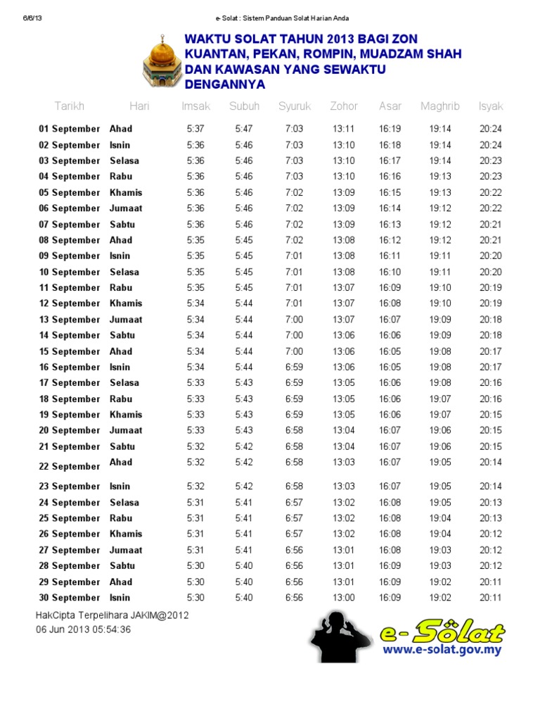 Penyusunan waktu solat fardhu telah diajarkan sendiri oleh malaikat jibrail kepada nabi muhammad s a w. Kuantan malaysia terletak di 7113 73 km barat laut dari mekah. Waktu solat kuantan pekan rompin dan muadzam shah 2020 imsak. Jadual waktu solat kuantan waktu solat adalah peruntukan tempoh atau selang masa tertentu bagi masyarakat muslim menjalani syariat solat sama ada fardhu ataupun sunat.
