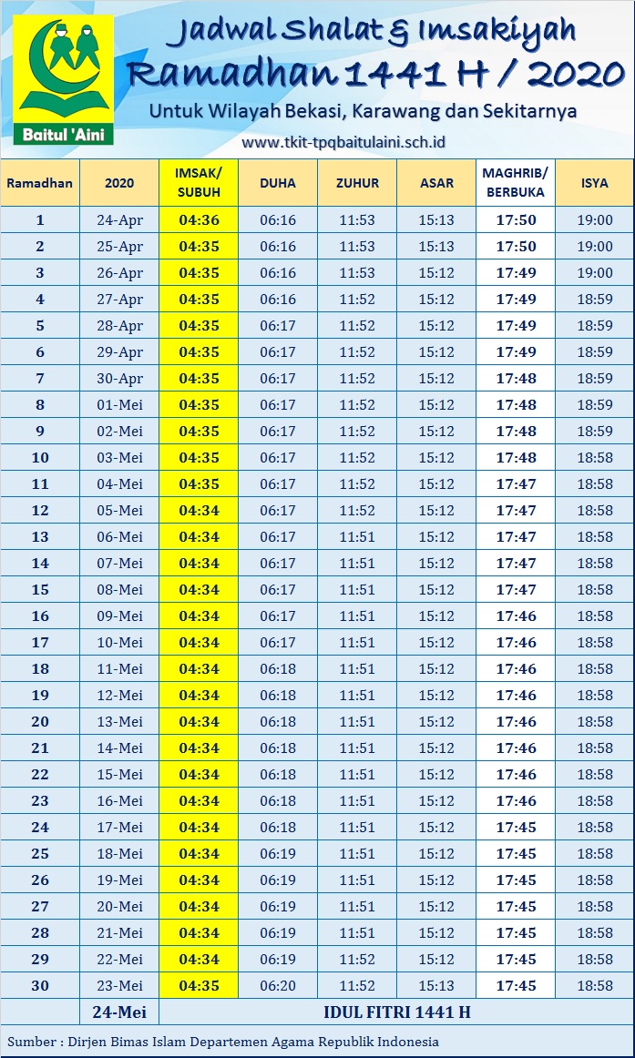 Yang saya cantumkan diatas adalah jadwal untuk satu bulan ini anda bisa juga melihat jadwal sholat hari ini. Sholat fardhu bisa dilaksanakan di rumah atau masjid. Jadwalsholat web id website rujukan jadwal sholat imsak sekarang dan update tiap hari. Waktu adzan atau jadwal sholat subuh dhuha dzuhur ashr maghrib isya bulan oktober 2020 untuk wilayah bekasi dan sekitarnya.