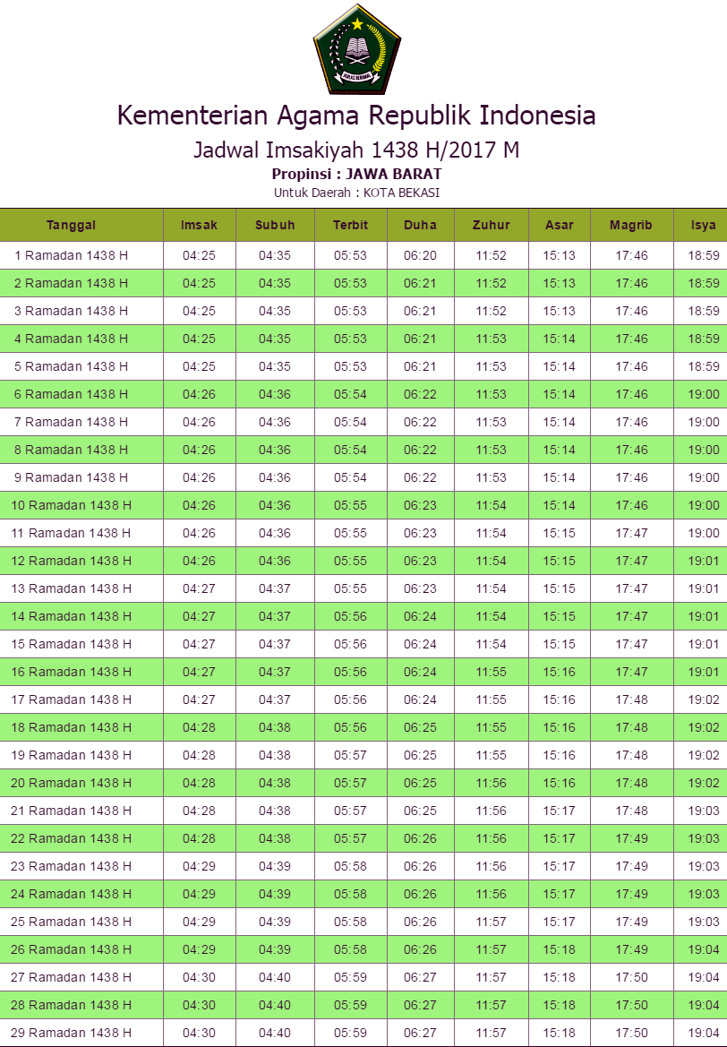 Dapatkan sumber terpercaya dari azan dan waktu shalat di bekasi dengan jadwal shalat mingguan dan bulanan bekasi. Perhitungan waktu shalat sesuai standar internasional depag departemen agama ditjen bimas islam kemenag ri juga pilihan metode lainnya untuk menyesuaikan keakuratan data. Jadwal sholat atau waktu sholat versi baru dan terupdate untuk wilayah jakarta dan seluruh indonesia. Kota bekasi indonesia terletak di 7934 15 km barat laut dari mekkah.